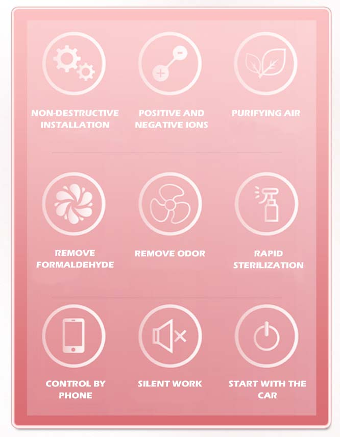 system absorbs aroma through a micro-pump, and circulates through the vehicle ventilation duct to emit aroma into the car. Then,the positive and negative ion generator is used to generate positive and negative ions to neutralize the positive and negative charges in the air, instantly releasing huge energy, causing the death of bacteria, and achieving the effect of rapid sterilization and purification.At the same time, car fragrance purification system can effectively improve the odor in the car and enhance the comfort and luxury of the whole vehicle.