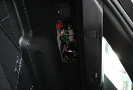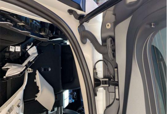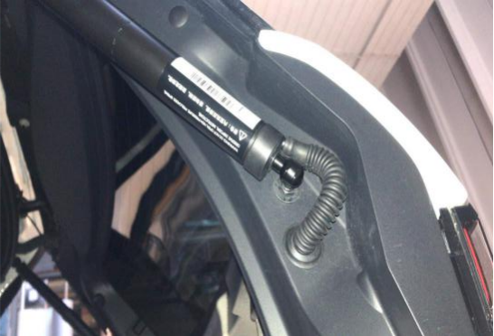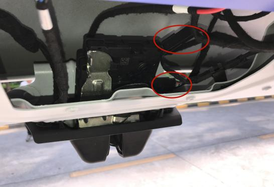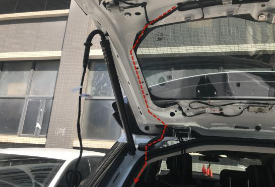 | 13. Unplug the original tailgate lock plug, then connect to our three-way adapter socke. | 14. Pass the strut wire and the electric suction wire along the original car harness to the left side of the tail compartment. |