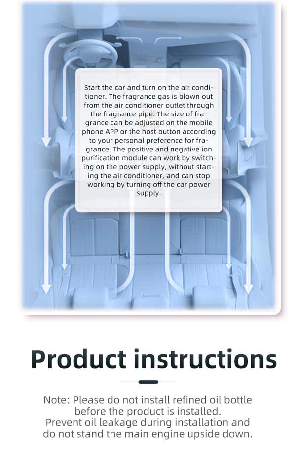 The car intelligent fragrance system adopts two-fluid atomization technology. The ultra-quiet air pump compresses the air to accelerate the separation of the molecules of the high-purity essential oil into particles, so as to maintain the lasting stability of the original composition and fragrance of the essential oil. Then use the positive and negative ions generated by the positive and negative ion generator to neutralize the positive and negative charges in the air and release huge energy instantly, resulting in the death of bacteria and achieving the effect of rapid sterilization and purification. At the same time, it can effectively improve the odor in the car and enhance the comfort and luxury of the whole vehicle. The fragrance brought by pure plant essential oils gives people comfort and tranquility, relieves anxiety, and refreshes and delights.